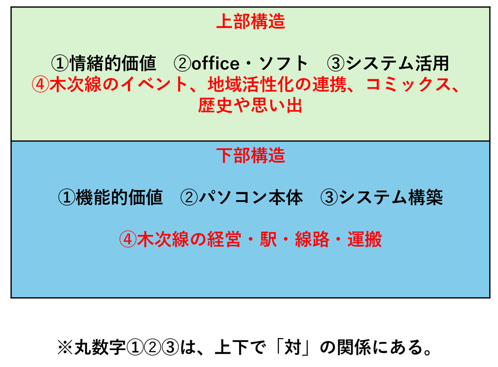 下部構造は、社会の土台となる生産様式や生産関係など経済的な土台である。木次線では、線路や駅、そこで行われるサービスや運搬、そして販売。もちろん線路の安全管理の業務も含む。
