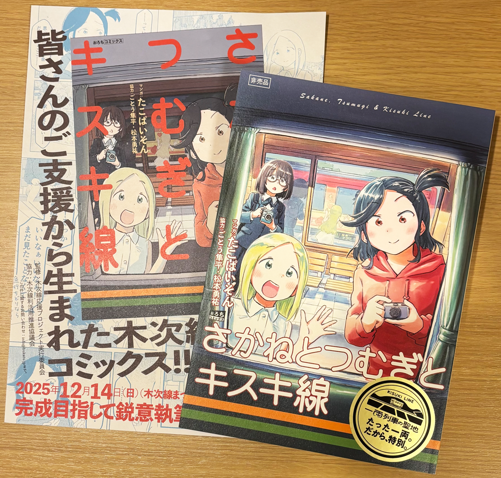 12月14日、島根県・木次線木次駅前のチェリヴァホール会館で、木次線まつりが開催された。昨年、この祭りにて発表されたクラウドファディングによる「コミックス刊行」の完成本『さかねとつむぎとキスキ線』がお披露目され、木次線利活用推進協議会の石飛厚志雲南市長と糸原保奥出雲町長に贈呈された。わあせてクラウドファンディング協賛者の一部の方に手渡された。