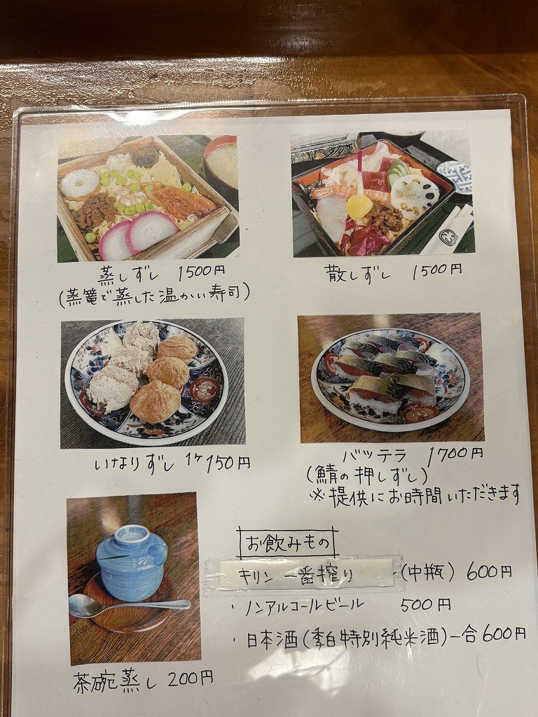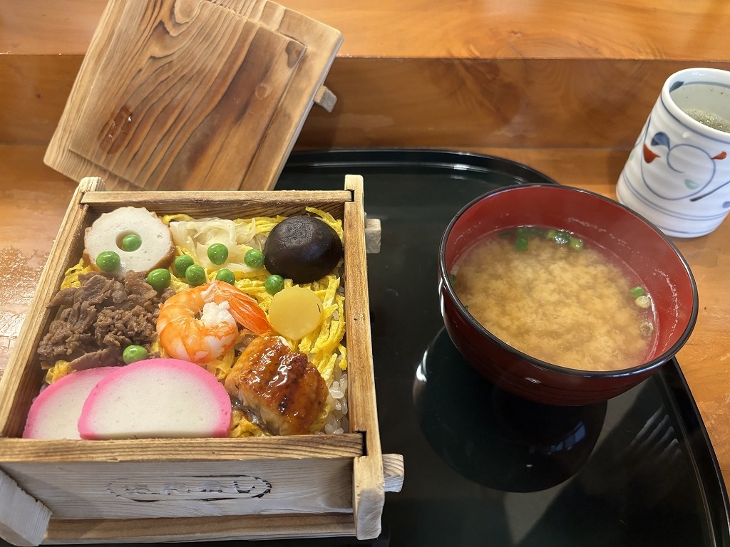 酢飯の上に錦糸卵に蒸しエビとシイタケ、野焼き(トクビレの焼き抜き蒲鉾)やうなぎに牛しぐれ煮をのせて、蒸篭で蒸した温かいちらし寿司である。