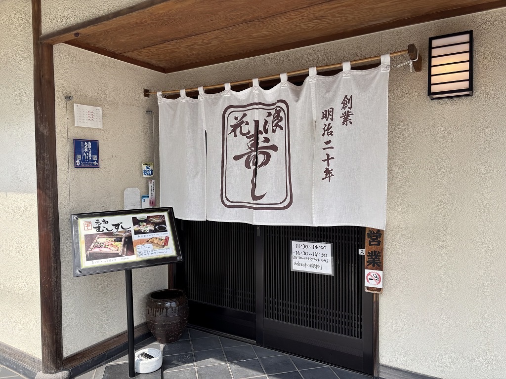 右手の角に暖簾のかかった平屋の建物がある。昔から変わらぬ静寂とした佇まいをしている。そこが「蒸し寿司」発祥の店・「浪速寿司(なにわ寿司)」である。